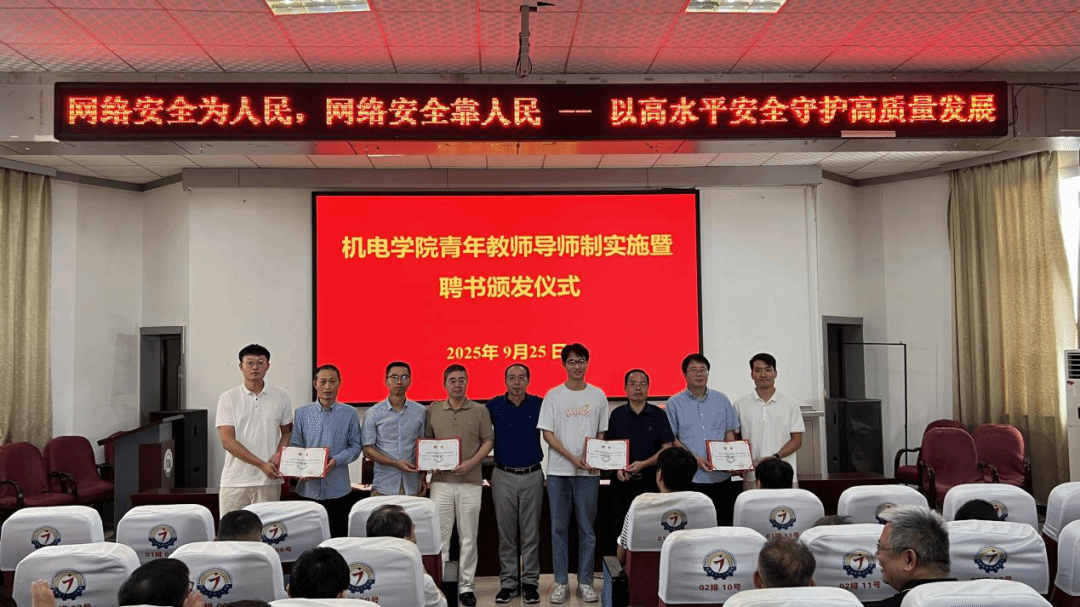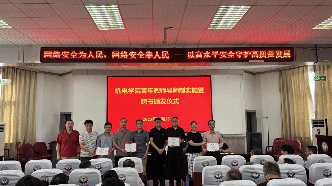 在庄重的乐曲声中,匡唐清与副经理张海共同为8位导师颁发聘书,青年教师与导师一起合影。